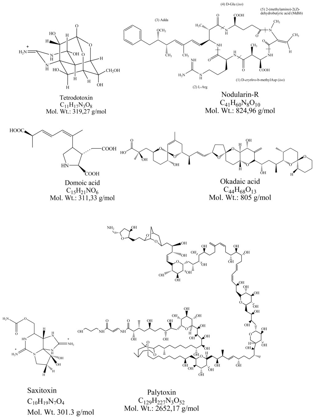 Structures of tetrodotoxin, nodularin, domoic acid, okadaic acid, saxitoxin palytoxin, brevetoxin and ciguatoxin.