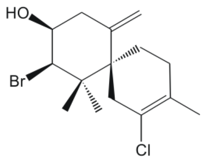 - Sims, JJ; Lin, GHY; Wing, RM. Marine natural products: Elatol, a halogenated sesquiterpene alcohol from the red alga Laurencia elata. Tetrahedron Lett. 1974, 39, 3487–3490. [Google Scholar]