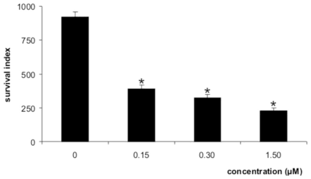 Figure 3 shows the effects of the elatol on the L. amazonensis-macrophage interaction. When the parasites were treated with elatol, a dose-dependent decrease of intracellular amastigotes was observed. The survival index was calculated as 392.0 for 0.15 μM; 325.0 for 0.30 μM; and 230.0 for 1.5 μM. These results correspond to rates of inhibition of survival as high as 57, 65, and 75%, respectively. The IC50 for the intracellular amastigote form was 0.45 μM. The intracellular forms are a great challenge in the treatment of leishmaniasis. All the results were significant at p ≤ 0.05 compared to the control group, by Student’s t-test. Amphotericin B showed IC50 of 0.06 μM and 0.31 μM against the promastigote and intracellular amastigote forms, respectively. Elatol was also evaluated for its potential toxic effects on macrophage strain J774G8. When macrophages were treated with elatol, the 50% cytotoxic concentration (CC50) was 1.4 μM. The toxicity to the macrophage and the activity against protozoa were compared by using the selectivity index (SI) (ratio: CC50 macrophage J774G8 cells/IC50 protozoa). The observed SI for the intracellular amastigote forms was 3.0 times less toxic to the macrophage than to the protozoa.