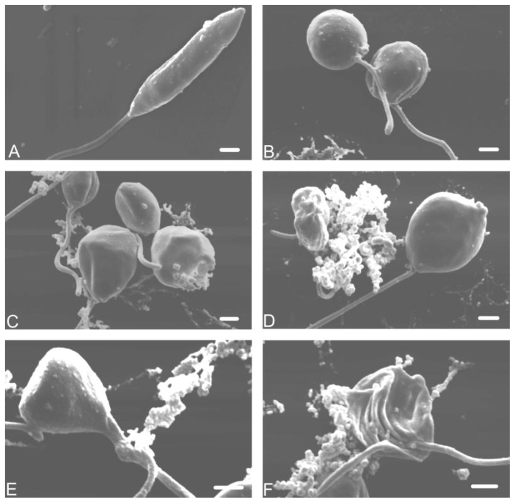 Scanning electron microscopy of promastigote forms of L. amazonensis treated with elatol after incubation for 48 h at 25 °C. (A) Control; (B–F) Parasites after treatment with IC50 of elatol. Bars = 1 μm.