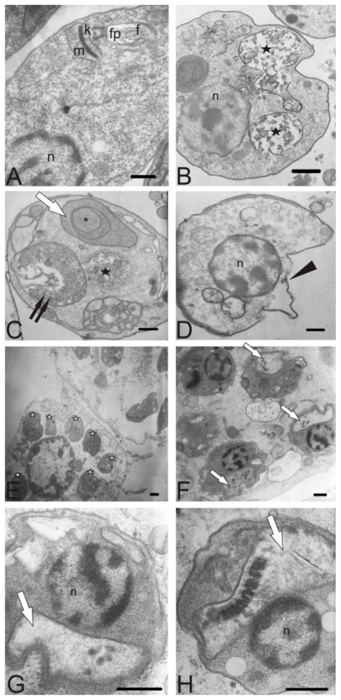 Ultrastructural effect of elatol after incubation for 48 h at 25 °C on promastigote and intracellular amastigote forms of L. amazonensis, observed by transmission electron microscopy. (A) Promastigote control; (B–D) Promastigote treated with IC50 of elatol; (E–H) Intracellular amastigote forms treated with IC50 of elatol. Elatol treatment led to swelling of the mitochondria (white arrow), autophagic vacuoles (black stars), appearance of concentric membrane structures inside the organelle (asterisk), destabilization of the plasma membrane (arrowhead), extension of the endoplasmic reticulum (two arrows), and intracellular amastigotes in peritoneal macrophages (white star). n: nucleus; f: flagellum; fp: flagellar pocket; k: kinetoplast; m: mitochondrion; Bars = 1 μm.