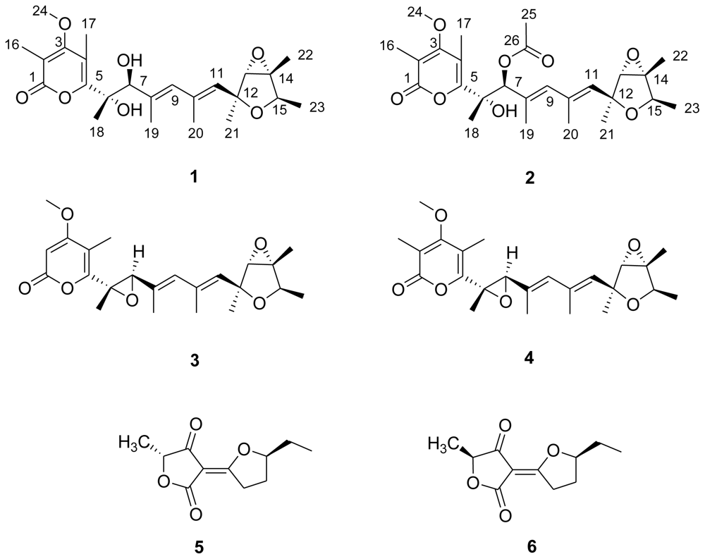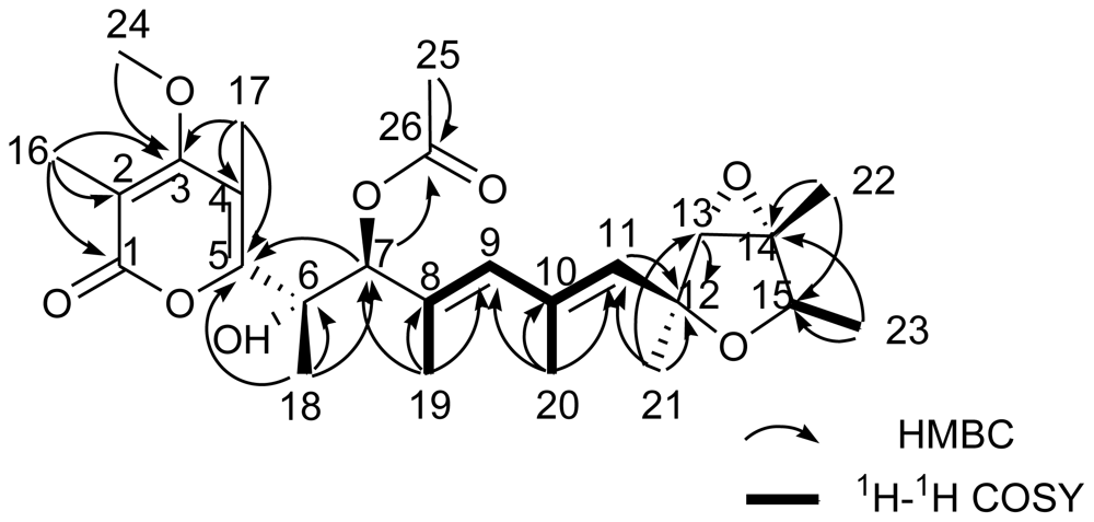 Compound 1 was obtained as yellow oil. The HRESIMS, in combination with 1H and 13C NMR data, indicated a composition of C24H34O7, requiring 8 unsaturations. The NMR spectra of 1 were compared to that of verrucosidin and found to be almost the same except for H-6/C-6, H-7/C-7, C-8 and C-10 [19–22]. Taking into account the degree of unsaturation, the molecule should have a ring-opened structure. The 1H and 13C NMR spectra of compound 1 exhibited signals for 32 protons and 24 distinct carbons, respectively. A heteronuclear multiple-quantum coherency (HMQC) NMR experiment established all one-bond 1H-13C connections as indicated in Table 1. The heteronuclear multiplebond correlation (HMBC) NMR spectrum displayed 1H-13C couplings from the methyl protons 18-H (δH 1.40) to C-5 (δC 159.7), C-6 (δC 78.8) and C-7 (δC 79.8), from the methyl protons 19-H (δH 1.82) to C-7 (δC 79.8), C-8 (δC 133.9) and C-9 (δC 134.3), and from the methyl protons 20-H (δH 1.89) to C-9 (δC 134.3), C-10 (δC 134.4), and C-11 (δC 133.0), thereby establishing the existence of a heptadiene moiety. The 1H-1H COSY NMR experiment revealed correlations from 9-H to 19-H, 9-H to 20-H and 20-H to 11-H supporting this conclusion. The 13C NMR chemical shifts of five downfield signals corresponding to C-1 (δC 165.0), C-2 (δC 110.4), C-3 (δC 169.2), C-4 (δC 111.8) and C-5 (δC 159.7), were in close agreement to those for an α-pyrone unit [19,22,23]. Two singlet olefinic methyl protons 16-H (δH 2.01) and 17-H (δH 2.21) exhibited HMBC correlations to their adjacent carbons in the α-pyrone moiety, C-1 (δC 165.0), C-2 (δC 110.4) and C-3 (δC 169.2); C-3 (δC 169.2), C-4 (δC 111.8), and C-5 (δC 159.7), respectively, as indicated in Table 1. Additionally, the methoxy protons 24-H (δH 3.79) revealed 1H-13C coupling to a quaternary carbon C-3 (δC 169.2), indicating the connection of the methoxy moiety to the C-3 position in the α-pyrone substructure. The long range couplings from olefinic methyl protons 17-H (δH 2.21) to C-5 (δC 159.7), from the methyl protons 18-H (δH 1.40) to C-5, and from the methine proton 7-H (δH 4.61) to C-5, indicated a connection between the partial heptadiene structure and the α-pyrone moiety. The quartet methine protons 15-H (δH 4.12), the doublet methyl protons 23-H(δH 1.18), and the 1H-1H COSY signal between them suggested the methyl group was located at C-15. The long range couplings from the methyl protons 22-H (δH 1.47) to C-14 (δC 67.4) and C-15 (δC 76.7), and from the doublet methyl protons 23-H (δH 1.18) to C-14 (δC 67.4) and C-15 (δC 76.7), linked the quaternary carbon C-14 to C-15. 1H-13C long range couplings from the methyl protons 21-H (δH 1.41) to C-11 (δC 133.0), C-12 (δC 80.1) and C-13 (δC 67.5), from an oxygenated methine proton 13-H (δH 3.43) to C-12 (δC 80.1), and from an olefinic methine proton 11-H (δH 5.53) to C-12 (δC 80.1) connected the quaternary carbon C-12 to the heptadiene moiety. The two oxygenated carbons C-13 (δC 67.5) and C-14 (δC 67.4) were concluded to form an epoxide ring. In contrast, two further deshielded oxygenated carbons C-6 (δC 78.8) and C-7 (δC 79.8), which had the higher chemical shifts, were connected to hydroxy groups respectively. This speculation was confirmed by the HRESIMS data. The molecular formula of 1 was determined from HRESIMS as C24H34O7, corresponding to the difference of one water molecule in the molecular formula between 1 and 4. Therefore, compound 1 was suggested to be a ring-opened derivative of 4.