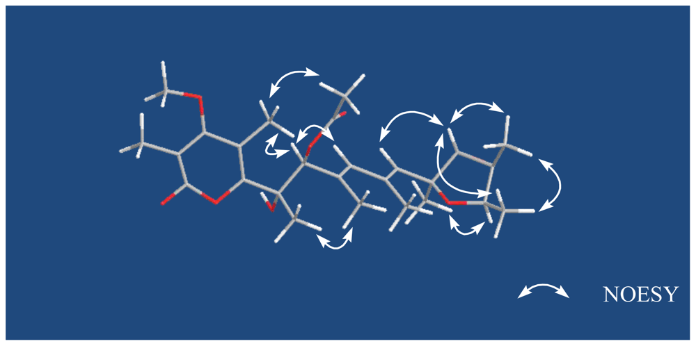 On the basis of identical chemical shift values and coupling constants for both compounds, the relative configuration of the tetrahydrofuran in 1 was proposed to be the same as that of verrucosidin, which was assigned by X-ray crystal diffraction [24]. Key NOESY enhancements between 11-H and 13-H, 13-H and 22-H, 23-H and 11-H, 22-H and 23-H, as well as a weak enhancement between 15-H and 21-H supported the orientations of these groups in tetrahydrofuran ring (Figure 3). The geometry of C-8 was confirmed to be E by the NOE observation between 7-H and 9-H. And the NOESY enhancements between 7-H and 17-H, 18-H and 19-H, determined their steric configuration respectively.