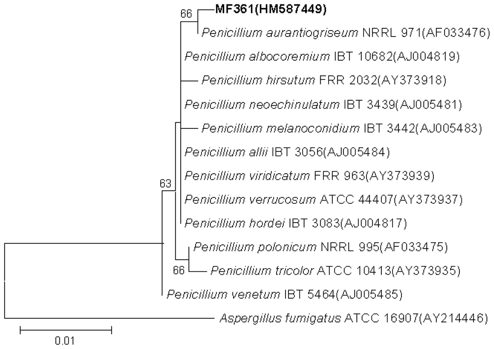 The marine derived fungus Penicillium aurantiogriseum was isolated from marine mud obtained in the Bohai Sea, and identified by morphology and sequence analysis of its internal transcribed spacer (ITS) region and 5.8S rDNA (GenBank accession number HM587449) using conventional primer pair ITS1(5″-TCCGTAGGTGAACCTGCGG-3″) and ITS4(5″-TCCTCCGCTTATTGATA-TGC-3″). The total genomic DNA of marine-derived fungus MF361 was extracted using the EZNA kit (Omega). The polymerase chain reaction product is 534 bp. The purified PCR products were sequenced (HuaDa Bio., Beijing, China). Multiple alignments with sequences of most closely related fungi and calculations of levels of sequence similarity were carried out using CLUSTAL W [29]. The phylogenetic tree was constructed using the neighbour-joining method [30], in MEGA 4.0 [31], as shown in Figure 4. The topology of the phylogenetic tree was evaluated by the bootstrap resampling method with 1000 replicates [32]. The fungus has been assigned the accession number MF361 in the culture collection at the Institute of Microbiology, Chinese Academy of Sciences, Beijing.