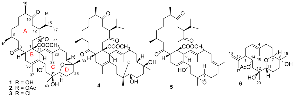 Biscembranes are a class of marine natural products with unusual structure patterns, which are mainly found in the marine soft coral genus of Sarcophyton (S. tortuosum, S. glaucum, S. latum, and S. elegans). They are supposed to be biogenetically derived by a Diels–Alder cycloaddition of cembranoid-diene and cembranoid-dienophile [1–8]. Recently, we found the soft coral Lobophytum pauciflorum also contains a variety of biscembrane analogues, but they presented the structure pattern with antipodal Diels–Alder cycloaddition and were named isobiscembranoids [9]. This finding provided a new marine organism to enrich the chemical diversity of biscembranoids. Our continuing interest in the chemical diversity of this specimen led to the isolation of five new biscembranoids (1–5) and a new monomeric cembrane (6) (Figure 1). This paper reports the structural elucidation of these new compounds and their bioactivity.