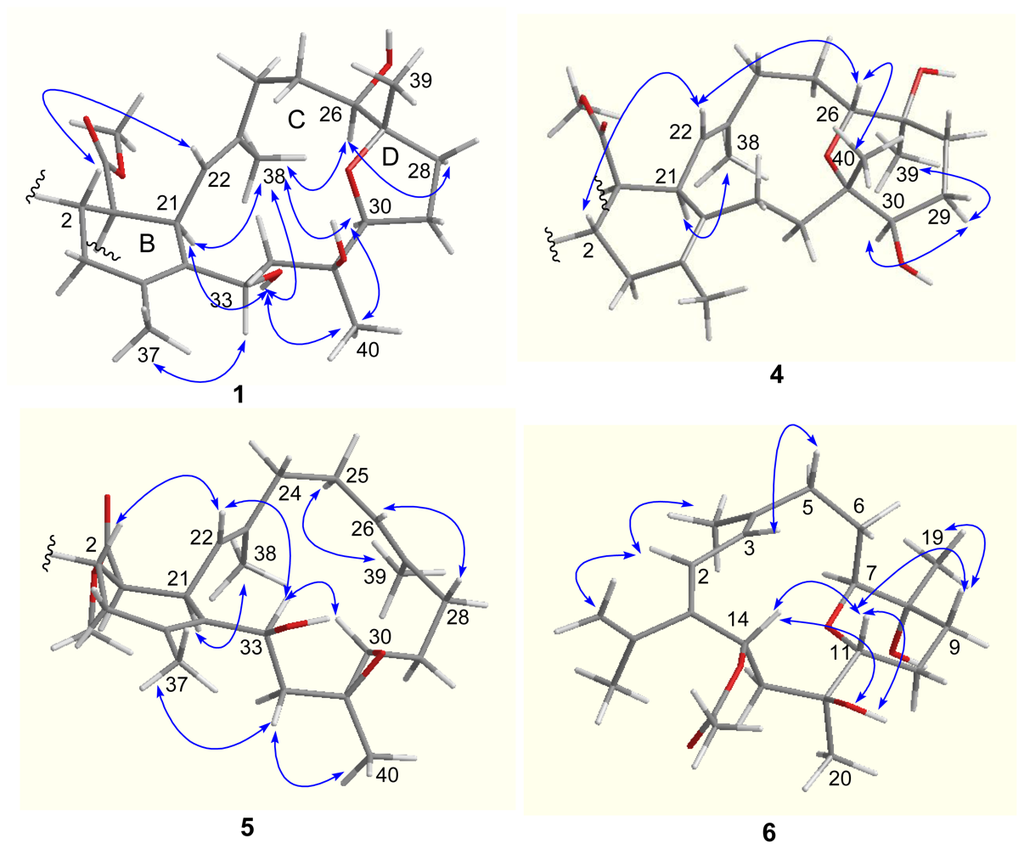 Key NOE correlations of 1, 4–6 related to rings B–D.