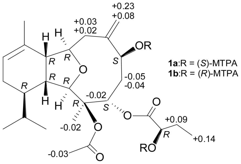 In order to determine the absolute configuration, the eunicellin 1 was treated with (−) or (+)-MTPA chloride to yield the (S)- and (R)-MTPA esters 1a and 1b, respectively [12–14]. Comparison of the 1H NMR chemical shifts for 1a and 1b (Δ values shown in Figure 1) led to the assignment of the S-configuration at C-6. The C-24 hydroxy group in the 2-hydroxybutyrate moiety was also assigned as R-configuration. Therefore, the absolute configurations of all chiral centers of 1 were assigned as 1R, 2R, 3R, 4S, 6S, 9R, 10R, 14R, 24R.