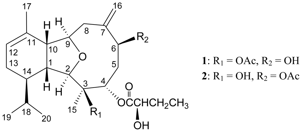 From the 1H–1H COSY spectrum of 1, it was possible to identify the separate spin systems among H-1/H-2; H-4/H2-5/H-6; H2-8/H-9/H-10; and H-10/H-1 (Table 1). These data, together with the HMBC correlations between H-1/C-2, −3, −10; H-2/C-3, −4, −9; H-4/C-3, −6; H2-5/C-3, −4, −6, −7; and H2-8/C-6, −7, −9, −10, established the connectivity from C-1 to C-10 within the ten-membered ring (Table 1). An exocyclic carbon-carbon double bond at C-7 was confirmed by the HMBC correlations between H2-16/C-6, −7, −8 and H2-8/C-16. The hydroxy proton signal at δH 2.84 was revealed by its 1H–1H COSY correlations to H-6 (δH 4.21), indicating its attachment to C-6. The location of 2-hydroxybutyrate group in 1 was confirmed by an HMBC correlation between H-4 (δH 5.14) and the 2-hydroxybutyrate carbonyl (δC 171.4, s). Thus, the remaining acetate ester was at C-3, an oxygenated quaternary carbon which bonded to the C-15 tertiary methyl and is confirmed by the HMBC correlations between H-2/C-15; H-4/C-15; and H3-15/C-2, −3, −4. The ether bridge between C-2 and C-9 was supported by an HMBC correlation between H-2/C-9. The 1-isopropyl-4-methylcyclohexene ring, which is fused to the ten-membered ring at C-1 and C-10, was elucidated by the 1H–1H COSY correlations between H-12/H2-13/H-14/H-1; H-14/H-18; and H-18/H3-19(H3-20) and further supported by the HMBC correlations between H-1/C-11, −14; H-2/C-14; H-10/C-11; H3-17/C-10; and H-18/C-1. The vinyl methyl at C-11 was confirmed by the HMBC correlations between H3-17/C-10, −11, −12 and further supported by the allylic coupling between the olefin proton H-12 and H3-17 (J = 0.8 Hz). Therefore, the planar structure of 1 was established.