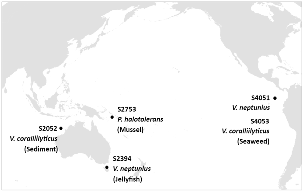 During a global research expedition ( http://www.galathea3.dk/uk), marine bacterial strains were isolated from environmental samples and screened for antagonistic activity against a pathogenic Vibrio anguillarum, strain 90-11-287. Three hundred and one bioactive strains were identified as Vibrionaceae based on 16S rRNA gene similarities [8]. Pure cultures of strains were stored in cryoprotectant solution at −80 °C until being analyzed in the present study.