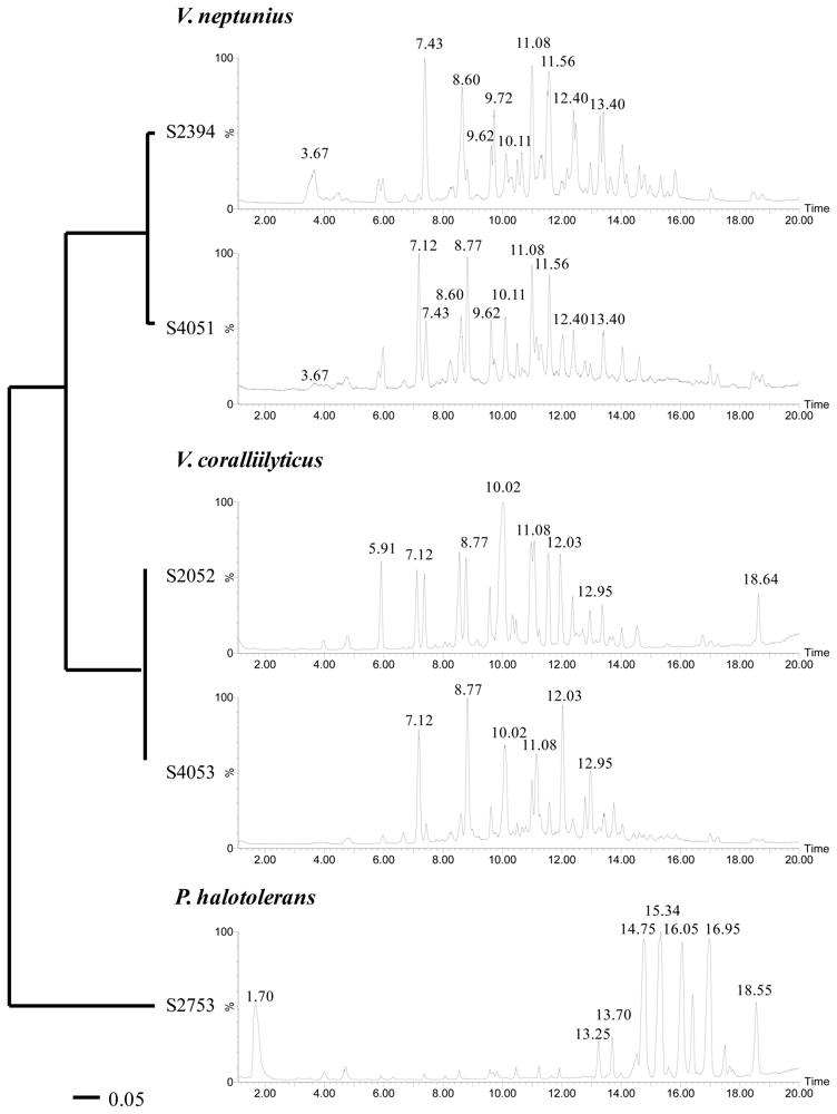 Phylogenetic and chemical relationship between five bioactive Vibrionaceae based on neighbor-joining analyses of aligned toxR gene sequences and LC-MS Total Ion Chromatograms (TIC). The scale bar relates to the number of base substitutions in toxR gene sequences (as displayed by branch lengths in the phylogenetic tree).
