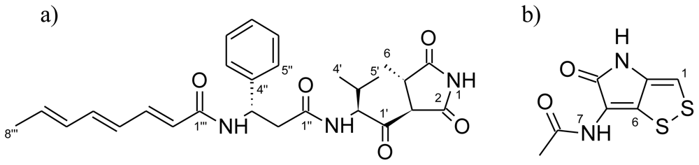 We thank the Danish Instrument Center for NMR Spectroscopy of Biological Macromolecules for NMR time. Thanks to Louise Kjærulff for assisting in the purification of holomycin, and to Kamilla Spanggaard and Anja Sander for help with bioassays. Funding from the Programme Committee for Food, Health and Welfare under the Danish Strategic Research Council is acknowledged. The present work was carried out as part of the Galathea 3 expedition under the auspices of the Danish Expedition foundation. This is Galathea 3 contribution no. P70.
