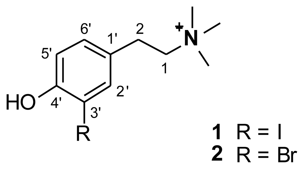 1H and 13C-NMR features of compound 1 were nearly identical to those of 2, with regard to the number and shape of the signals. However, differences were observed in the chemical shift values of the signals present in the downfield region of the spectra (see Table 1). Significantly different were the chemical shift values of two aromatic carbons [δ 140.5 in 1 vs. δ 134.6 in 2 (C-2′) and δ 84.7 in 1 vs. δ 111.2 in 2 (C-3′)] and of one of the aromatic protons [δ 7.68 vs. δ 7.49 (H-2′)]. These evidences suggested the presence in 1 of a 1,2,4-trisubstituted benzene ring like in 2 having, as substituents, an hydroxyl, a iodine atom and the -CH2CH2 +N(CH3)3 group.