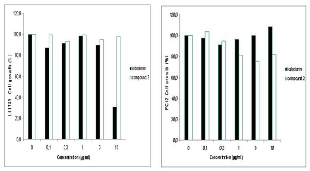 The capability of both compounds 1 and 2 to affect cell viability has been estimated in vitro on two different cell lines, L5178Y (mouse lymphoma) and PC12 (rat pheochromocytoma), using the microculture tetrazolium (MTT) assay. The results were statistically evaluated using the paired Student’s t-test []. Iodocionin (1) exhibited an acute activity against lymphoma cells with an IC50 of 7.75 μg/mL, showing 70% inhibition of cell growth at a concentration of 10 μg/mL, while it did not affect at all the viability of PC12 cells. In contrast, compound 2 displayed in both cell systems no statistically significant reduction of cell growth at concentrations between 0.1 and 10 μg/mL. These preliminary results, illustrated in Figure 2, indicate that iodocionin seems to selectively inhibit lymphoma rather than pheochromocytoma cell proliferation. Moreover, comparison of the effects of compounds 1 and 2 revealed a definite structure–activity relationship for the nature of the halogen atom present on the aromatic ring.