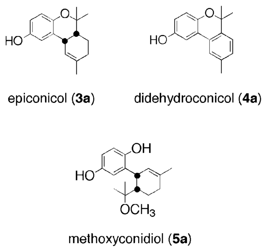 Structures of epiconicol (3a), didehydroconicol (4a) and methoxyconidiol (5a).