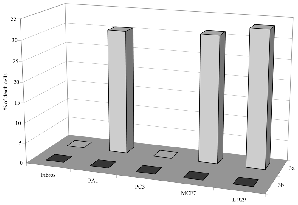 Effect of the compounds 3a and 3b on cell lines at 5 μM (PA1 ovarian, PC3 prostatical, MCF7 mammalian, human fibroblast and L929 murine fibroblasts). The antiproliferative effect was assessed by an evaluation of metabolical activity (RRT). Each experiment was carried out in triplicate.