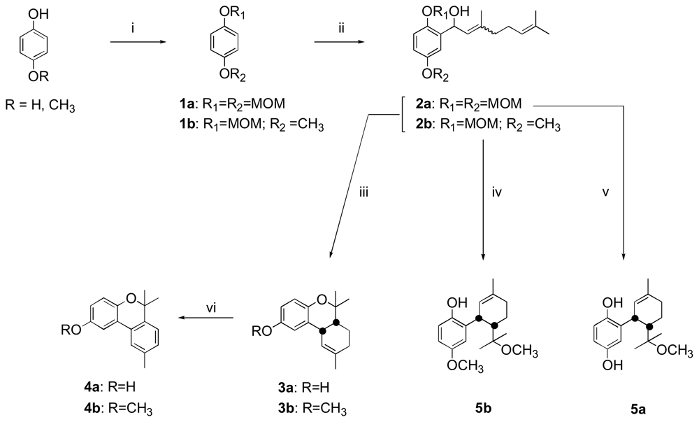 As previously described by Cruz-Almanza et al., the natural meroterpene 3a and the methoxy derivatives 3b–5b were synthesized starting from compounds 2a and 2b, respectively, using acidic conditions (Scheme 1) [13]. These two geranylhydroquinone derivatives used as key intermediates were prepared from methoxymethyl (MOM) protected hydroquinone 1a or MOM protected 4-methoxyphenol 1b by aromatic lithiation and subsequent treatment with citral. The new natural meroterpene 5a was synthesized by acidic treatment of 2a in methanol for 24 hours at 8 °C. Reaction time (24h) and constant temperature (8 °C) were found to be crucial in obtaining this compound; other conditions (room temperature with a shorter reaction time) led to the meroterpene 3a. The compound 5a was thus synthesized with a yield of 25%. It should be noted that the acidic treatment of 2a and 2b promoted dehydration followed by a rearrangement of the corresponding carbocation leading to meroterpenes 3a–b or 5a–b. This reaction was found to be diastereoselective with a cis/trans ratio greater than 4/1. The pair of cis isomers was purified, and finally, good yields of the new natural chromene 4a and its methoxy derivative 4b were obtained (70% yields) from 3a and 3b by dehydrogenation in the presence of sulfur at 250 °C. The 1H and 13C NMR spectra of compounds 3a, 4a and 5a were perfectly identical to those of the natural products epiconicol (3a), didehydroconicol (4a) and methoxyconidiol (5a) [11].