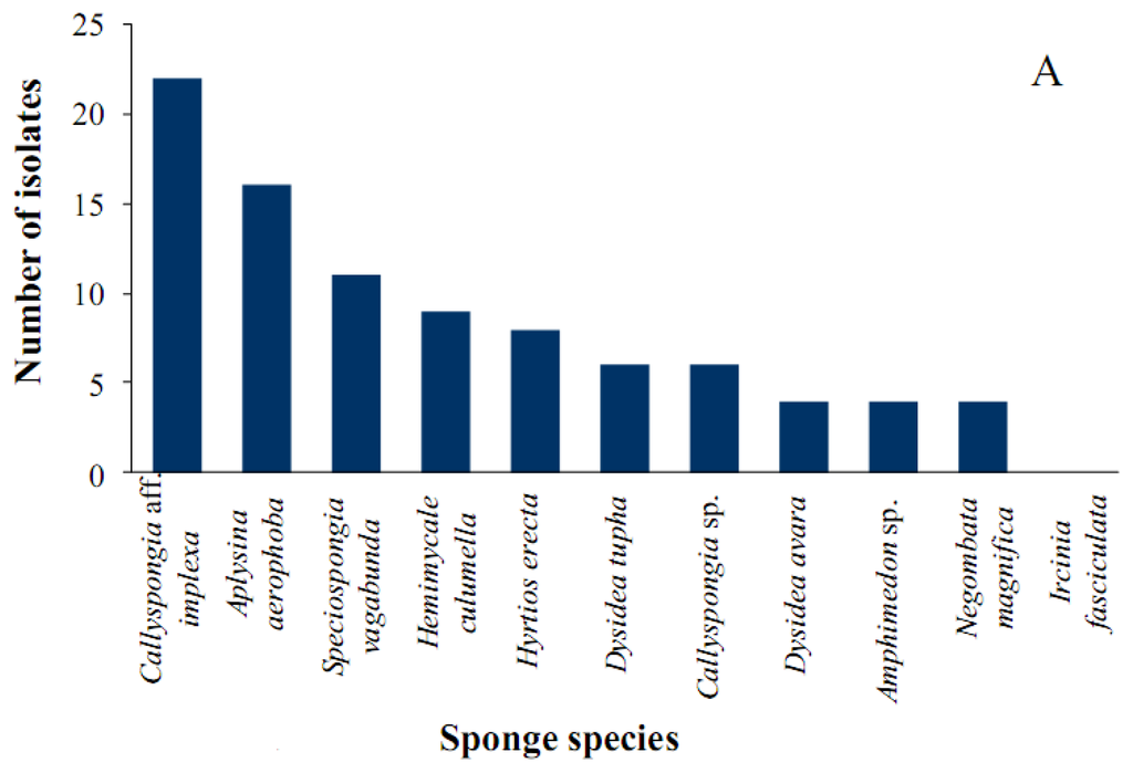 Number of actinomycete isolates (A) per sponge species, (B) per actinomycete genera and (C) per cultivation media.