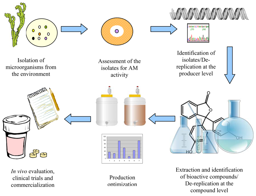 General procedure for the discovery of biologically active natural compounds, such as antimicrobials, of microbial origin. The procedure starts with the isolation of microorganisms from the environment, for example, from the surfaces of marine eukaryotes, followed by their antimicrobial activity screening and the identification of the producer organism. The bioactive compound is then purified and the chemical structure elucidated. Production optimization can be performed to maximize the yield of the desired compound for further in vivo trials and product development. Clip art images provided by Open Clip Art Library ( www.openclipart.org) are used in the figure.