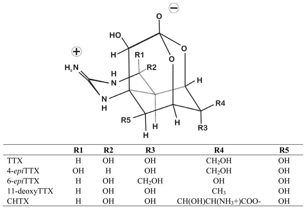 - Yasumoto, T; Yotsu-Yamashita, M. Chemical and etiological studies on tetrodotoxin and its analogs. J Toxicol: Toxin Rev 1996, 15(2), 81–90. [Google Scholar]