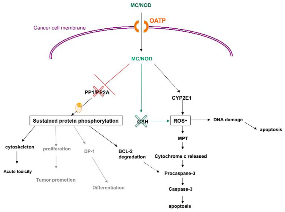 Cancer cell molecular targets and actions of cyanobacterial cyclopeptides. (MC = microcystin, NOD = nodularin, OATP = Organic Anion Transporting Polypeptides, PP = protein phosphatase, MPT = Mitochondrial permeability transition, ROS = reactive oxygen species, GSH = glutathione, CYP2E1 = Cytochrome P450 2E1, red cross symbol = inhibition, green cross symbol = consumption, black lines symbolize established action, grey lines symbolize likely actions).