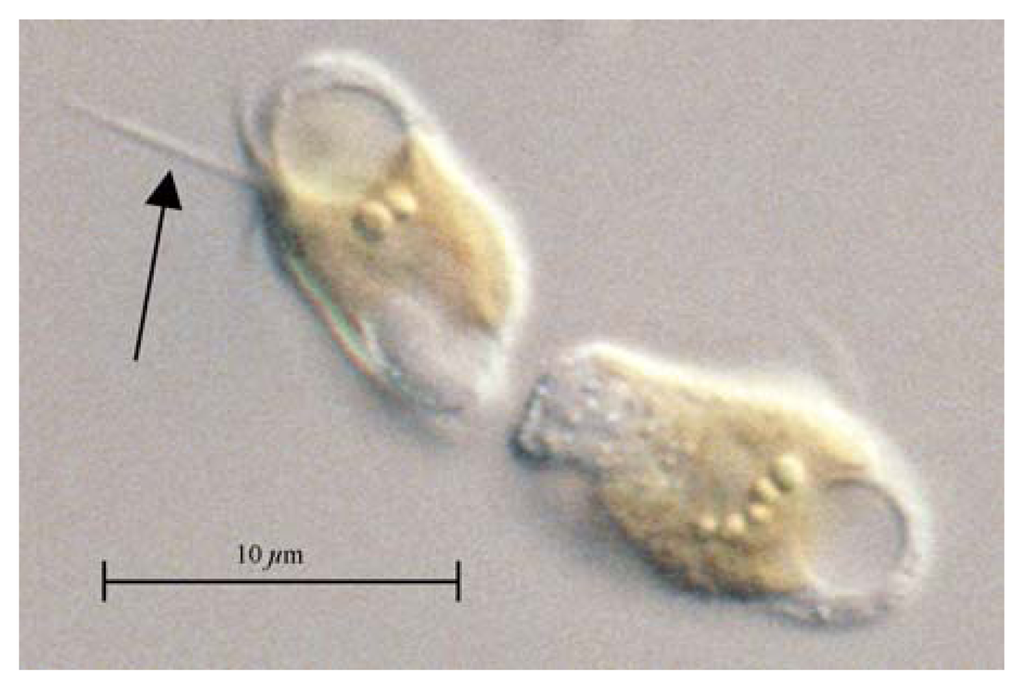 Light micrograph of two P. parvum cells (UTEX 2797). The haptonema (arrow) is shown projecting between the two flagella in the upper cell.