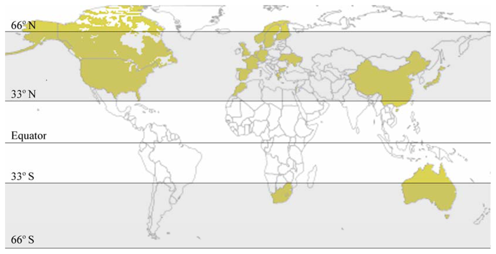 Global distribution of P. parvum by country where reported. Most blooms occur in temperate and subtropical zones. Adapted from [2,3,26], and others.