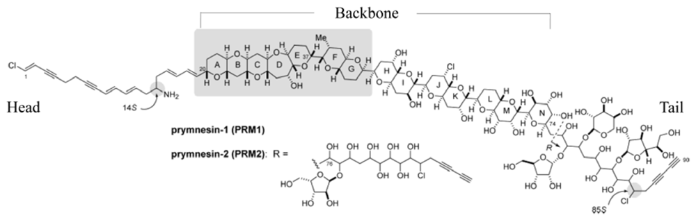 Structures of prym1 and prym2 (inset). Synthesis studies have confirmed the absolute conformation of the ring series A-K and the sinistral (S) chiral centers at carbons 14 and 85. Reproduced with minor modifications with permission from American Chemical Society [37].