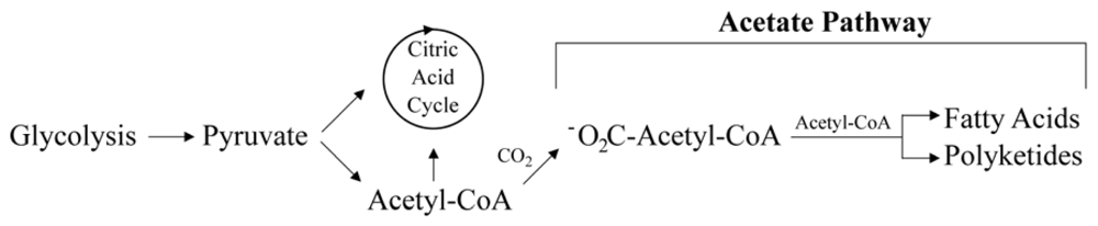 Very little is known about the synthesis of prymnesins in vivo. However, it is very likely that prym1 and prym2 are derived from acetate-related metabolism based on what we know about their structures. In other organisms, the acetate pathway is responsible for the generation of fatty acids, as well as numerous secondary products that include polyketides and non-ribosomal peptides (Figure 4) [57,58]. Both primary and secondary metabolites synthesized in this pathway utilize 2-, 3-, and 4-carbon basic skeletal types coupled to coenzyme-A (CoA) [58,59]. Subunits are subsequently combined by successive decarboxylative condensations resulting in chain elongation.