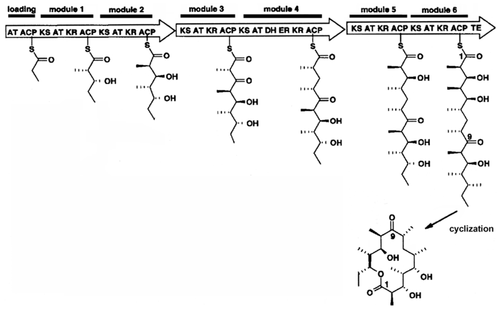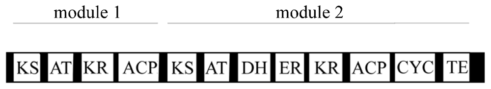 The biosynthesis of polyketides has many features in common with fatty acid synthesis and it uses similar, perhaps some of the same, enzymatic domains. Cane and Walsh [57] described polyketide synthase (PKS) as a modular “megaprotein” possessing a core catalytic domain and auxiliary (carrier) domains. The core domain contains the ketosynthase (KS), acyltransferase (AT) and the acyl carrier protein (ACP)—to which the growing polyketide molecule is tethered via an acyl-S-enzyme of the 20 Å long phosphopantetheine arm. The AT domain catalyzes priming of the donor ACP with monomers, and the carbon-carbon bond-forming step is performed by the KS domain. The auxiliary domains encode for ketoreductase (KR), dehydratase (DH), and enoyl reductase (ER). The growing polyketide is handed over from one reactive thiol group to the next by transacetylation reactions. This process is repeated until the ultimate chain length has been achieved, whereupon thioesterase (TE) facilitates the removal of the polyketide by hydrolysis at the distal end of the pantetheine prosthetic group. The individual enzymes function to modify the elongating molecule before adding the next subunit. Chain elongation ceases when all of the “programmed” subunits are incorporated, resulting in a single-chain carbon backbone. Some PKSs also contain enzymes for cyclization (CYC) in addition to other secondary modifications (e.g., methylation) [58,59]. Note that cyclization may occur prior to or after the release of the polyketide from TE.