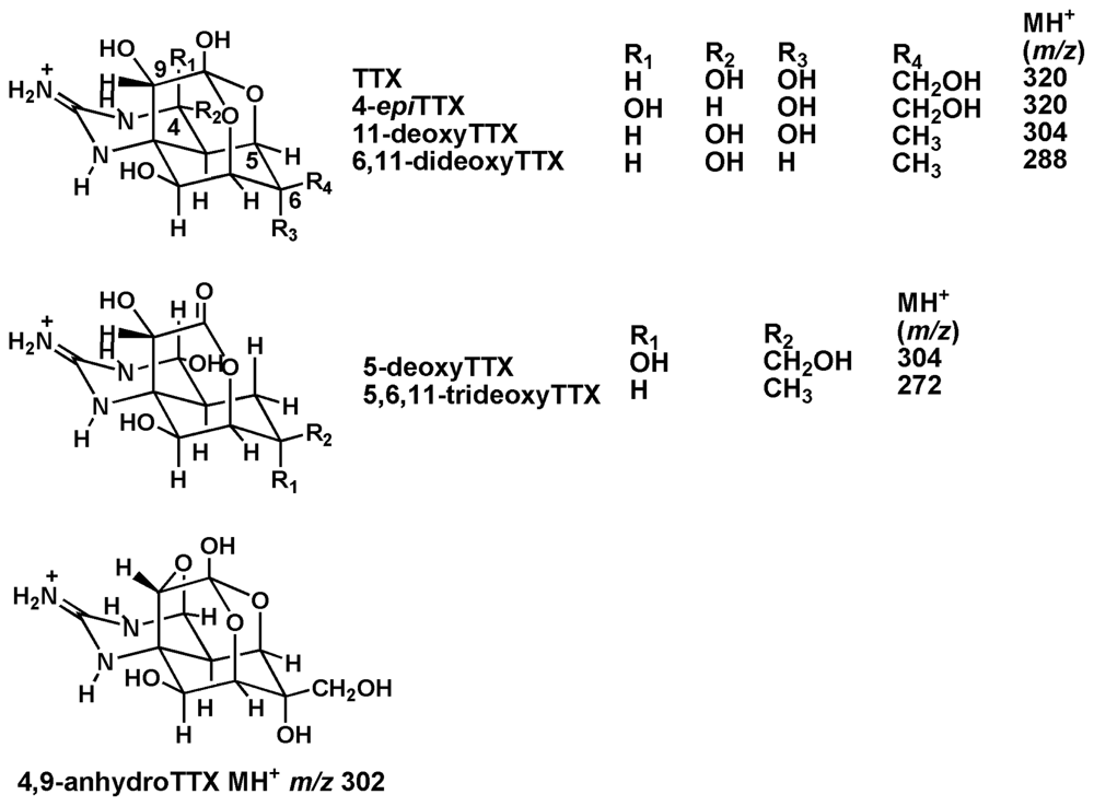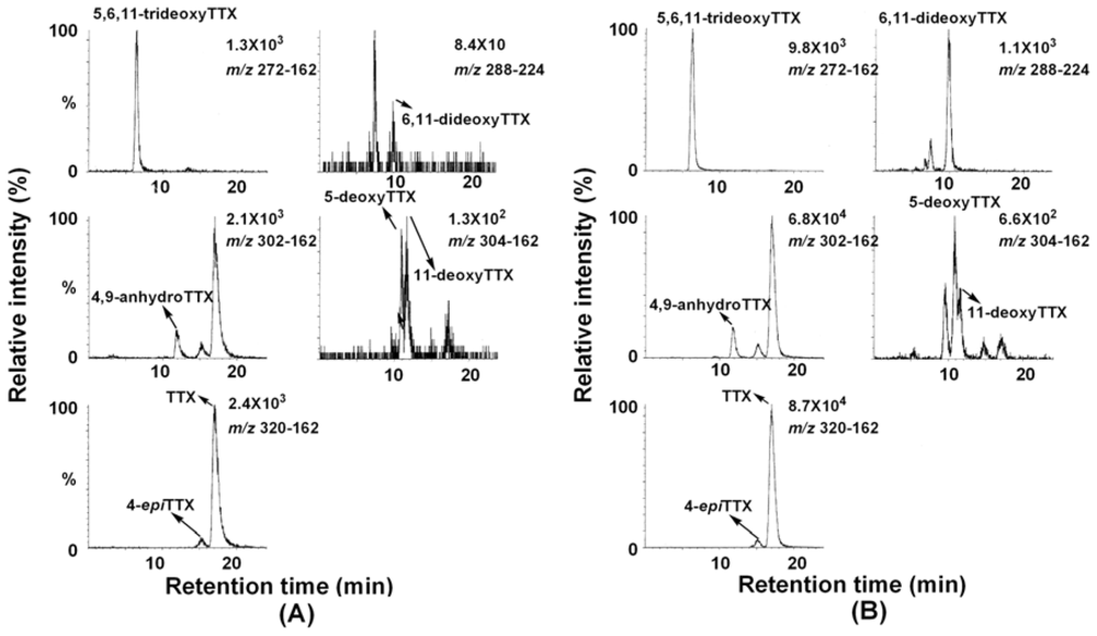 Herein we examined the contents of TTX and its deoxy analogs in the tissues of three female and three male specimens of the marine puffer fish F. niphobles collected at the southern coast of Korea, and in two brackishwater puffer fishes Tetraodon nigroviridis and Tetraodon biocellatus from Southeast Asia, purchased in a pet market in Japan [18], by LC/MS in HILIC mode.