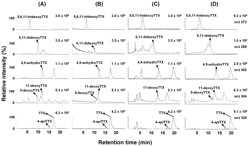 The mass chromatograms of LC/MS in SIM mode. (A) Volume of 4 μl of the semi-purified TTXs mixture containing TTX (53 pmol), 4-epiTTX (5.6 pmol), 4,9-anhydroTTX (7.4 pmol), 5-deoxyTTX (1.8 pmol), 11-deoxtyTTX (6.8 pmol), 6,11-dideoxyTTX (1.5 pmol), and 5,6,11-trideoxyTTX (38 pmol) prepared from ovary of F. poecilonotus as standard [10], (B) Sample solution (1 μl) of the ovary from female no. 3 F. niphobles, (C) Sample solution (1 μl) of whole body of no. 5 specimen of T. nigroviridis, (D) Sample solution (1 μl) of whole body of no. 2 specimen of T. biocellatus.