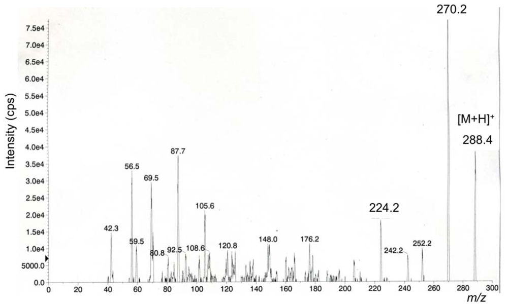 The fragment ion spectrum from [M+H]+ m/z 288 of 6,11-dideoxyTTX (150 pmol) injected into 0.2 mL/min of methanol. Collision energy: 42 eV.