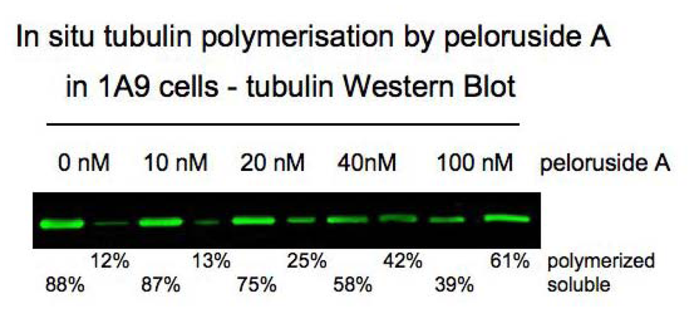Peloruside A-induced tubulin polymerization in 1A9 ovarian carcinoma cells. Cells were treated with peloruside A and a supernatant and pellet fraction electrophoresed. The gel was immunoblotted for α-tubulin. Image supplied by Arun Kanakkanthara.