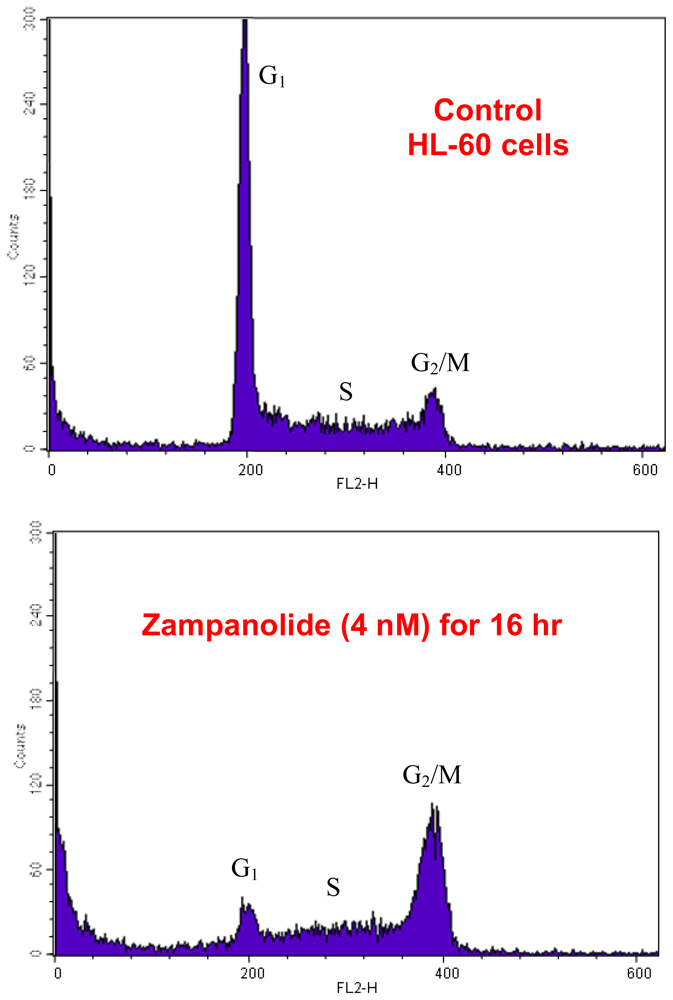 Effect of zampanolide on cell cycle progression using flow cytometry. HL-60 promyelocytic leukemic cells were treated with 4 nM zampanolide for 16 hr, stained with propidium iodide, and analyzed by flow cytometry. Graphs courtesy of Jessica Field.