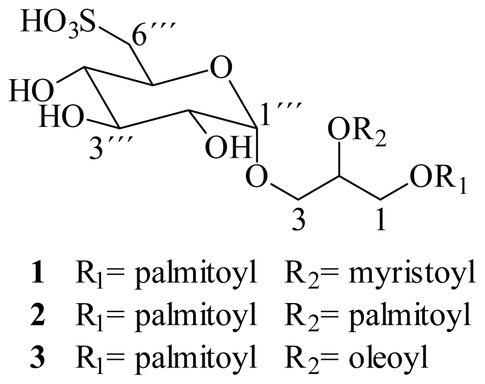 On the basis of the molecular formula obtained by high resolution positive FAB MS, 1H- and 13C-NMR data and the results from the selective hydrolysis, the structure of compound 1 was established as 1-O-palmitoyl-2-O-myristoyl-3-O-(6‴-sulfo-α-d-quinovopyranosyl)-glycerol, while compounds 2 and 3 were identified as 1,2-di-O-palmitoyl-3-O-(6‴-sulfo-α-d-quinovopyranosyl)-glycerol and 1-O-palmitoyl-2-O-oleoyl-3-O-(6‴-sulfo-α-d-quinovopyranosyl)-glycerol, respectively.