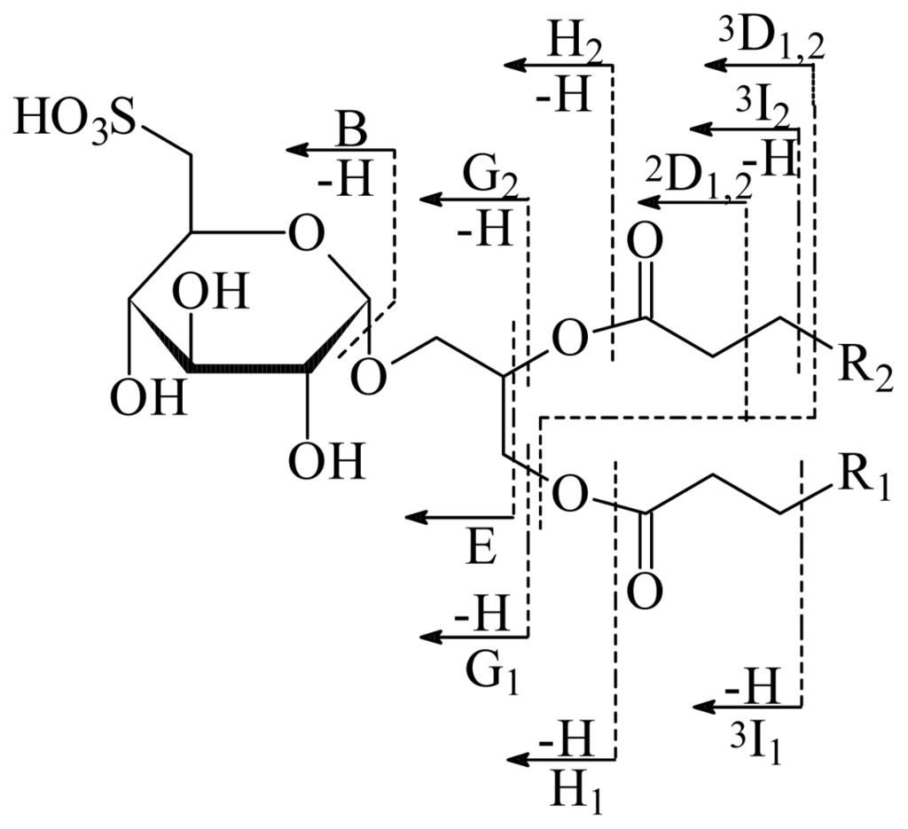 Nomenclature for cleavage of glycolipids and some fragmentation scheme of SQDG []. For the cleavage of fatty acyl chains the subscript in the symbol represents the relative position (sn-1 or sn-2) of the cleavage in the fatty acyl chain and the superscript the cleaved bond position relative to the carbonyl carbon of the fatty acyl group. In the proposed positive ions there are two sodium ions attached at the terminal sulfonic group.