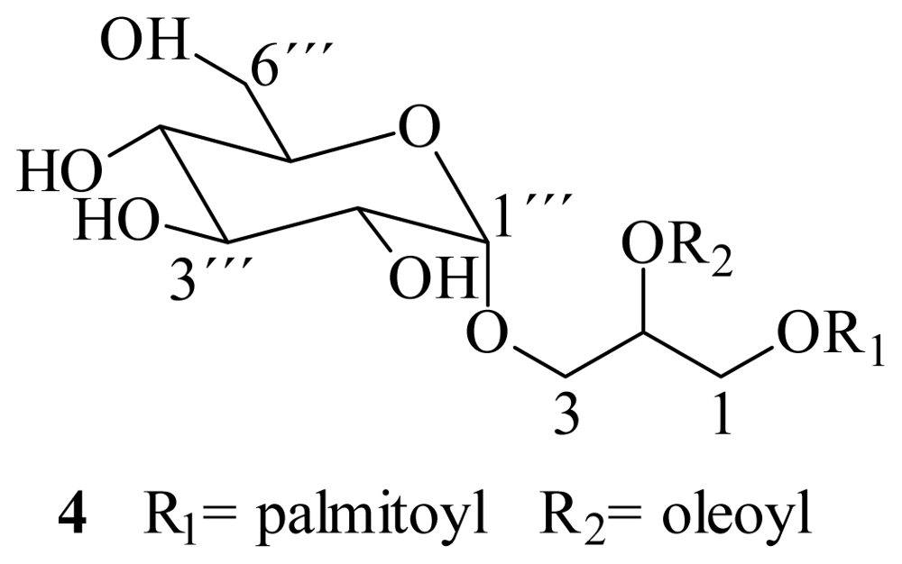Shao et al. [], reported the isolation of the sulfoglycolipid crassicaulisine, with myristoyl and palmitoyl as acyl groups at positions 1 and 2 of glycerol respectively, from the red alga Chondria crassicaulis. Compound 1, the major SQDG of L. variegata, corresponds to the positional isomer of crassicaulisine, where palmitoyl and miristoyl acyl groups are interchanged, i.e., at sn-1 and sn-2 respectively. There is a solitary reference in the literature on the identification of 1 from the brown alga Ishige okamurai []. In the case of compound 2, it has been isolated from several terrestrial and marine sources, as from leaves of Byrsonima crassifolia [,], from the brown seaweeds Ishige okamurai and Sargassum parvivesiculosum [,], from the green algae Caulerpa racemosa and Dictyochloris fragrans with notable selective antiviral activity against HSV-2 and a P-selectin receptor inhibitor [,]. Concerning compound 3, there are no reports of its isolation from natural sources; therefore it corresponds to a new natural product. Recently, the isolation of the glucosyldiacylglycerol 4, from the brown alga Sargassum fulvellum, was published (Figure 3). The proposed structure differing from 3 only in the presence of a glucosyl moiety, instead of the sulfonic derivative at C-6‴ []. However, it is noteworthy the chemical shift reported for C-6‴ of the glucose at δC 54.9, which is characteristic value for C-6‴ in sulfoglycolypids or aminoglycolipids. Therefore, the structure 4 should be revised.