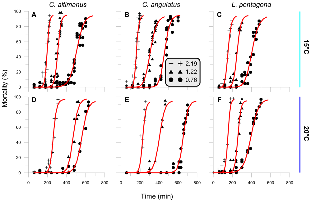 Larvae mortality (%), as a function of exposure time, for samples under the PAB treatment exposed to UV-B irradiances of 2.19, 1.22 and 0.76 W m−2, and temperatures of 15 and 20 °C. A, B, and C are experiments carried out with larvae exposed at 15 °C; D, E, and F are experiments carried out with larvae exposed at 20 °C. A total of 28 experiments were done, with at least one experiment (with triplicates) for each irradiance-temperature condition. Each symbol in the Figure represents the mean of the triplicates and the red curves are the best fit lines for each irradiance condition.