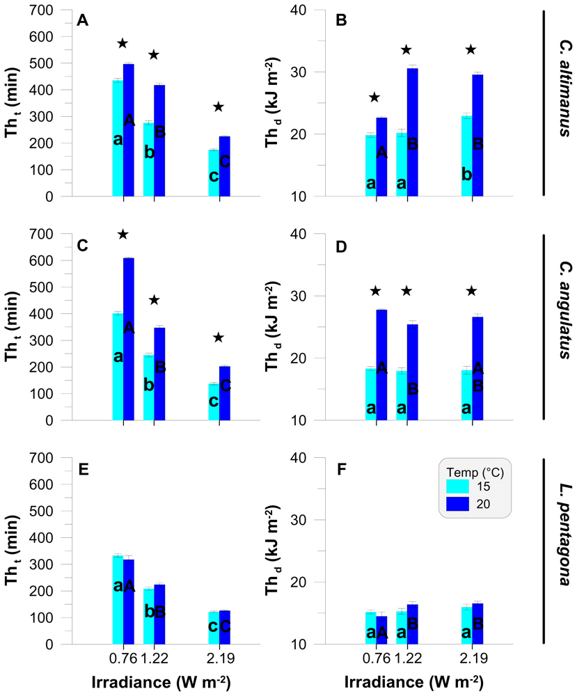 Threshold values for the three larvae species as a function of the UV-B irradiance level. Panels A, C, and E are the thresholds expressed in minutes of exposure (Tht), while panels B, D, and F are the thresholds (Thd) expressed in kJ m−2. The values are the mean and standard deviation (n ≥ 3). The * on top of the bars indicates differences between temperatures for each irradiance level. Lower case and capital letters indicate differences among irradiances at 15 °C and 20 °C, respectively.