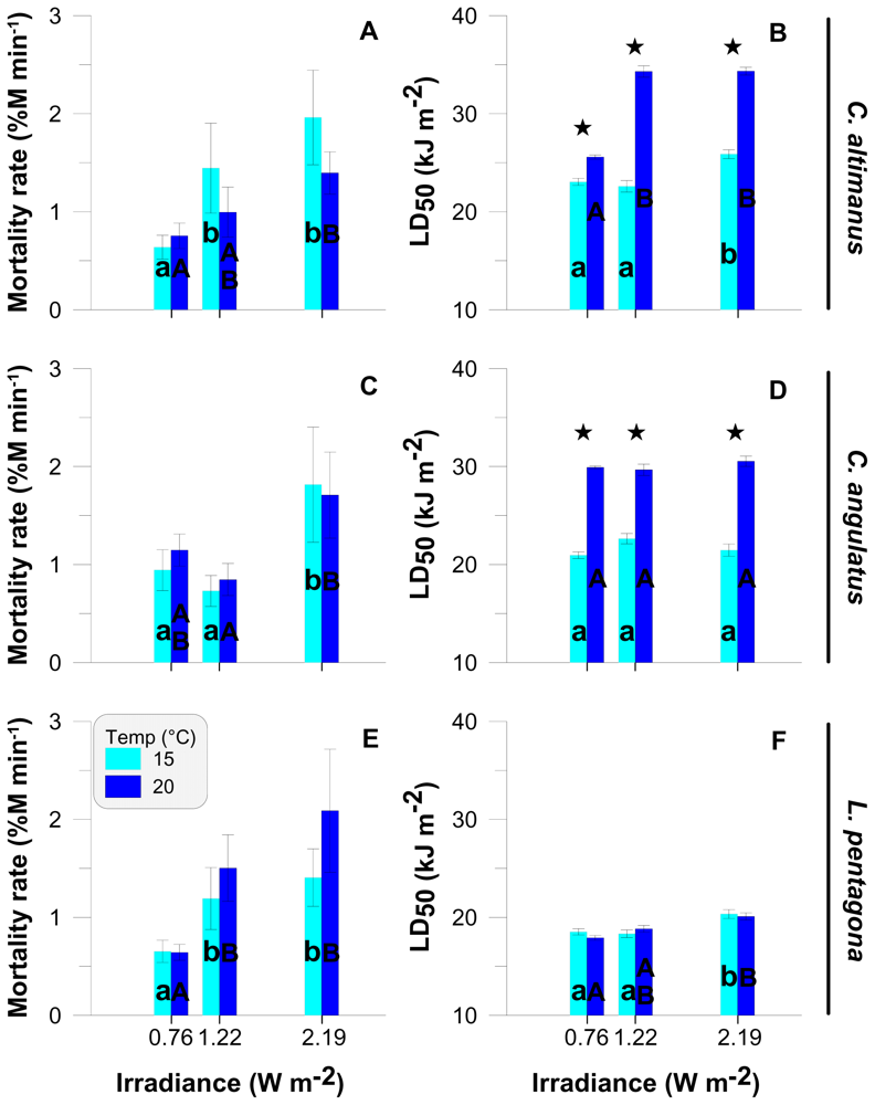 Rate of mortality (% mortality min−1) and LD50 (in kJ m−2) as a function of the UV-B irradiance levels for C. altimanus (A, B), C. angulatus (C, D), and L. pentagona (E, F). The values are the mean and standard deviation (SD) (n ≥ 3). * indicates significant differences between temperatures for each irradiance level. Lower case letters and capital letters indicate differences among irradiances at 15 °C and 20 °C, respectively.
