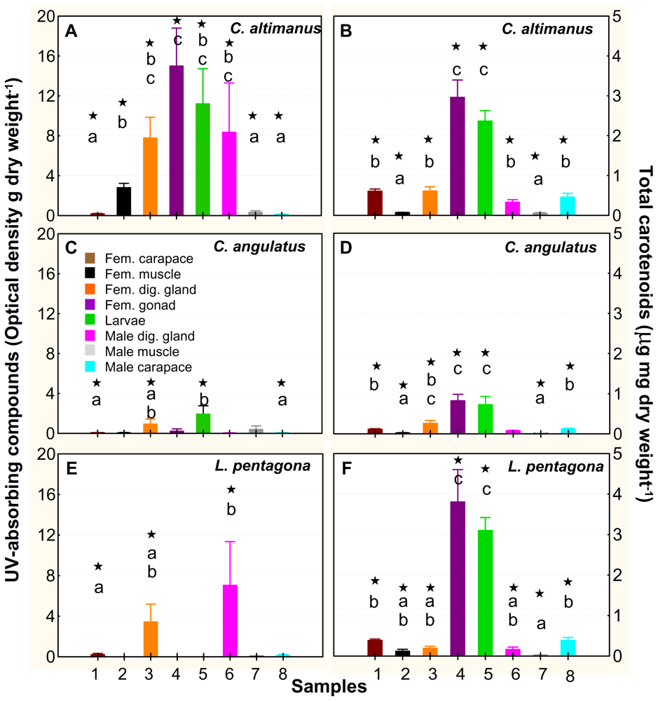 UV-absorbing compounds (A, C, and E) and total carotenoids (B, D, and F) found in the three species used in the experiments. The values are the mean and standard error (SE) of samples (n = 7–9) collected at three different periods during the spawning season and pooled together (explanation in the text). The numbers in the x-axis 1 to 4 indicate female tissues; number 5 corresponds to the whole larvae, and numbers 6 to 8 are male tissues. The * on top of the bars indicates that the concentration is significantly different from zero. Lower case letters indicate significant differences among tissues.