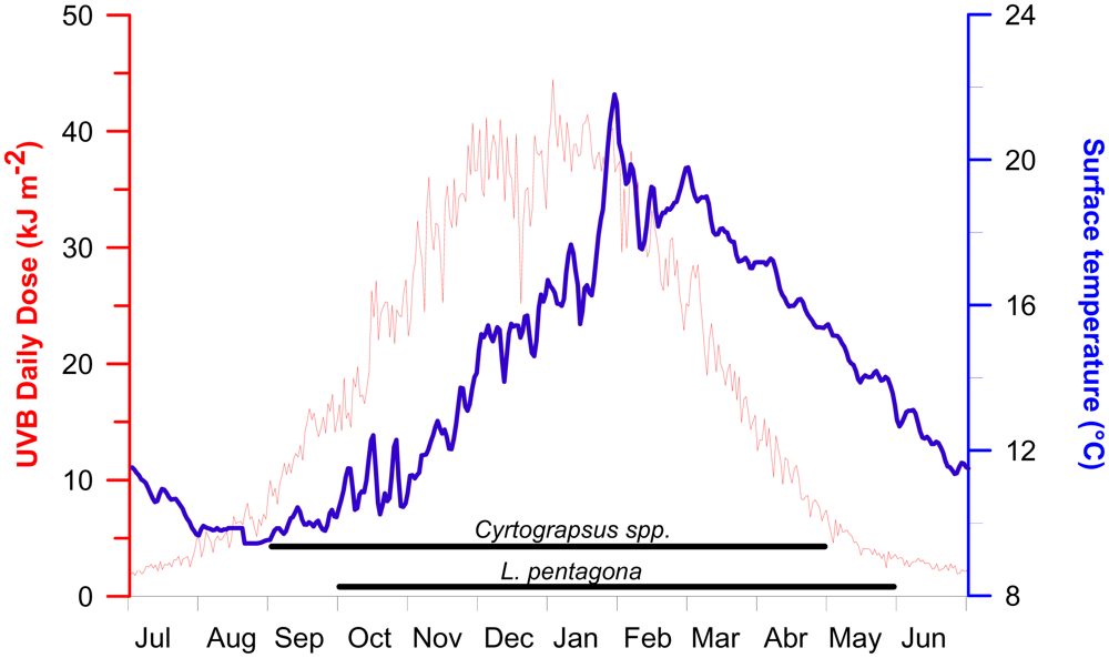Surface UV-B daily doses (red line) and surface water temperature (blue line) throughout the year in the study area (see Figure 6). The horizontal lines indicate the spawning season for Cyrtograpsus spp. and L. pentagona.