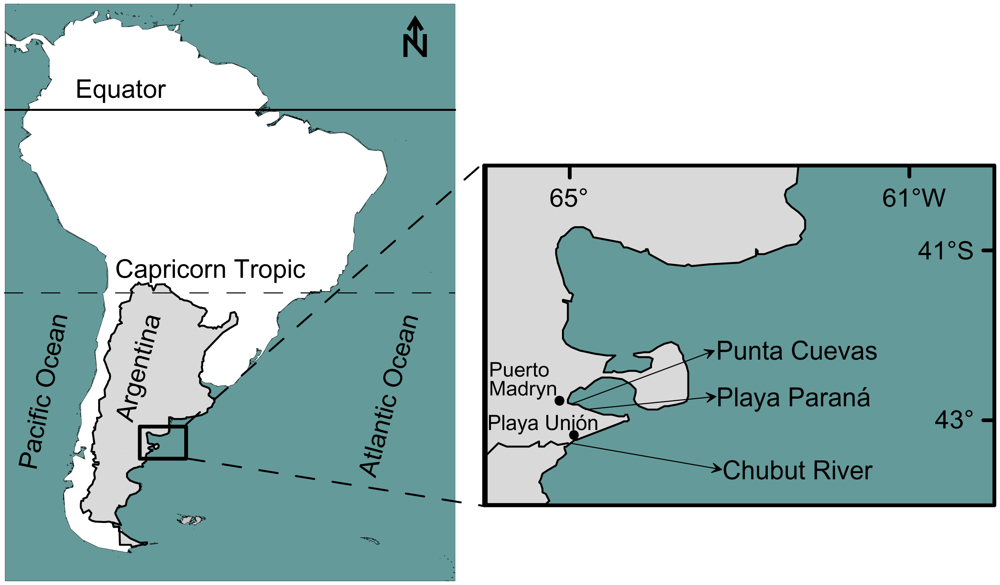 Ovigerous females (i.e., near to spawning) of the crabs Cyrtograpsus altimanus (Rathbun, 1914), Cyrtograpsus angulatus (Dana, 1851), and Leucippa pentagona (Milne Edwards, 1833) were collected during spring, summer, and autumn of the years 2007 and 2008 to obtain newly hatched larvae. The specimens were collected from different places in the Patagonian coast (Chubut Province, Argentina) (Figure 6): C. altimanus were obtained during low tide from intertidal rock pools in Punta Cuevas, while L. pentagona were collected from Playa Paraná by scuba diving. C. angulatus females were obtained from the Chubut River estuary using traps. All specimens were immediately taken to the laboratory at the Estación de Fotobiología Playa Unión (EFPU, 15–60 min from the sampling site) where they were kept in aquaria under a 12:12 light: dark photoperiod in a controlled-temperature chamber (at 15 or 20 °C, depending on the experiment, see below) for at least two days, when the experiments were performed to determine the combined effects of UVR and temperature on survival (see below). Specimens were fed once a week with fish meat, after which the seawater was replaced. Prior to the hatch period, females were transferred to an individual aquarium to get a pool of larvae (Zoea I) from the same female, thus reducing the potential variability between organisms within any one experiment. The aquaria were checked twice a day and only larvae less than 16 h from hatching were used in the experiments. A lamp providing dim light was placed in one side of each aquarium to allow larvae to swim towards the illuminated corner, where they were collected using a pipette. In this way, we selected healthy and photoactive larvae that were then used in the experiments.