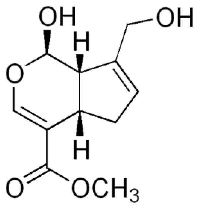 - Koo, H-J; Song, YS; Kim, H-J; Lee, Y-H; Hong, S-M; Kim, S-J; Kim, B-C; Jin, C; Lim, C-J; Park, E-H. Antiinflammatory effects of genipin, an active principle of gardenia. Eur. J. Pharmacol 2004, 495(2–3), 201–208. [Google Scholar]
