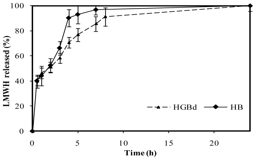 In contrast, medium crosslinking conditions, corresponding to 0.5 mM genipin incubated during 5 h at 50 ºC (named HGBd), led to a more controlled release compared with HB. These were the only crosslinking conditions that led to LMWH controlled release within those assayed in this study, summarized in Table 3. As shown in Figure 10, following a burst effect, LMWH release increased from 40% to 60% after 3 h in a similar way to that described for HB. Nevertheless, the drug release to the medium was slower throughout the period 4–8 hours. After 4 h, less than 70% of the LMWH had been released from medium crosslinked microspheres, which is significantly lower than 90% released from HB. Finally, 90% LMWH was released from HGBd after 8 hours, reaching 100% within the period 8–24 hours.