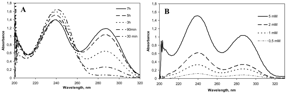 A 5 mg/mL chitosan solution was prepared by disolving it in deionized water. Genipin solutions of different concentrations (0–5 mM) were added and the resulting mixture was incubated for different time intervals (30 min–7 h) to allow the crosslinking to occur, at 50 ºC. The chitosan-genipin crosslinking reaction was characterized by UV/Vis (GBC UV/Vis 920, GBC Scientific Equipment Pty. Ltd., Dandenong, Australia). During the crosslinking reaction, spectra were obtained at certain time intervals in a wavelength range from 200 to 700 nm, at 2 nm resolution.