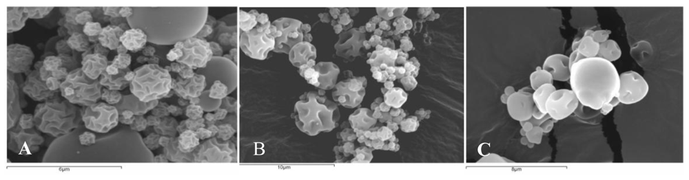 Figure 3 shows the morphology of chitosan microspheres crosslinked with genipin and loaded with clarithromycin (Figure 3A), tramadol hydrochloride (Figure 3B) or LMWH (Figure 3C) obtained by SEM. As can be seen, <10 μm microspheres were obtained in all cases. The obtained microspheres presented a smooth surface with indentations as a result of rapid particle shrinking during the drying process [].