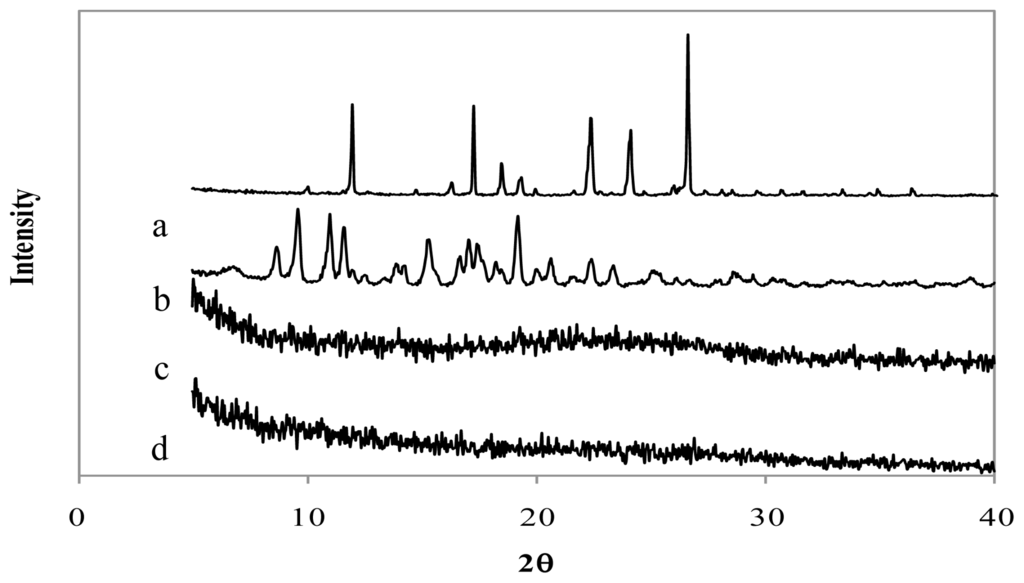 X-ray diffraction patterns of (a) genipin, (b) clarithromycin, (c) chitosan hydrochloride, (d) chitosan hydrochloride (5 mg/mL) microspheres loaded with clarithromycin (50% w/w) and crosslinked with genipin (1 mM) at 50 ºC for 5 h.