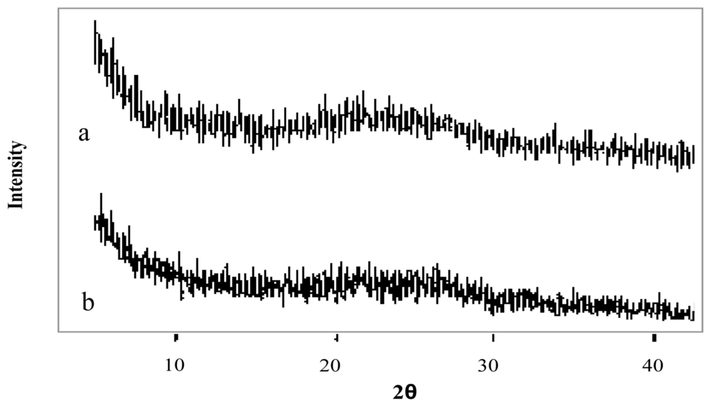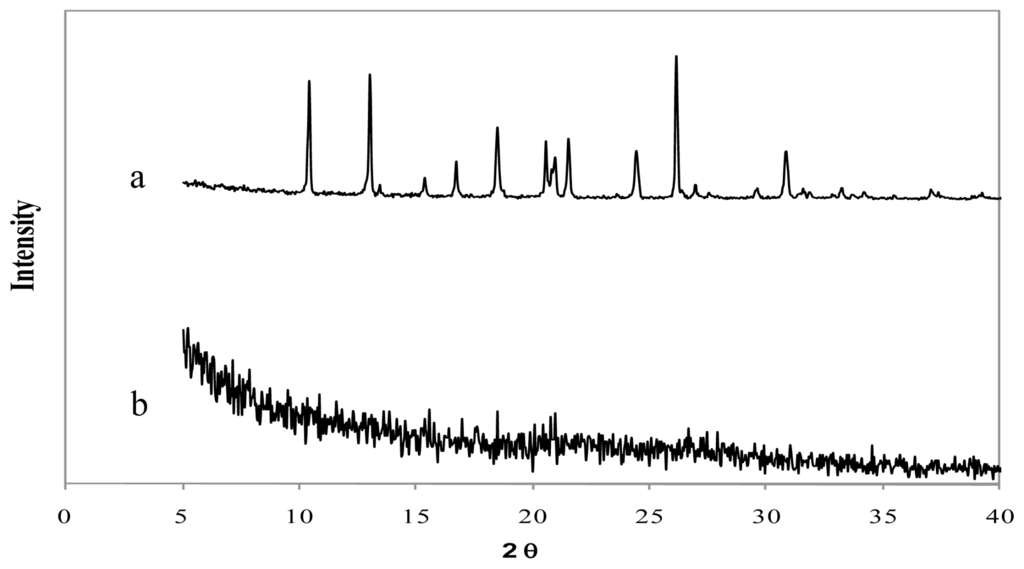 X-ray diffraction patterns of (a) tramadol hydrochloride and (b) chitosan hydrochloride (5 mg/mL) microspheres loaded with tramadol hydrochloride (30% w/w) and crosslinked with genipin (2 mM) at 50 ºC for 5 h.