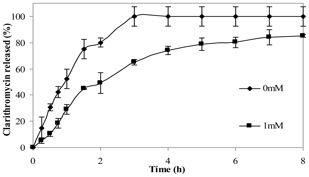 The effect of crosslinking microspheres with genipin on clarithromycin release in simulated gastric fluid (SGF) was studied. The addition of the crosslinking agent led to the slower release of the drug. Figure 7 shows clarithromycin release profiles of non crosslinked chitosan microspheres and from microspheres crosslinked with 1 mM genipin for 5 h at 50 ºC. After 3 h, microspheres without genipin had released 100% of the drug, while crosslinked microspheres had released 60% of clarithromycin. The release from microspheres crosslinked with 0.5 mM genipin did not show significant differences with microspheres with 1mM genipin (results not shown).